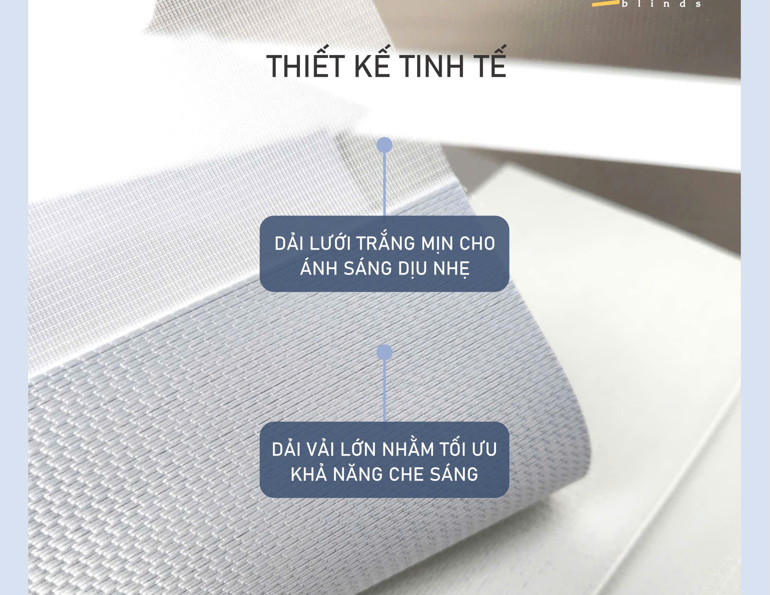 Điểm nhấn khác biệt của FERAL nằm ở dải vải được thiết kế lớn nhằm tối ưu hóa khả năng che sáng tuyệt đối khi rèm đóng kín. Song hành cùng đó, dải lưới trắng mịn màng, tinh tế giúp ánh sáng khuếch tán nhẹ nhàng, tạo cảm giác thư giãn và thanh lịch.